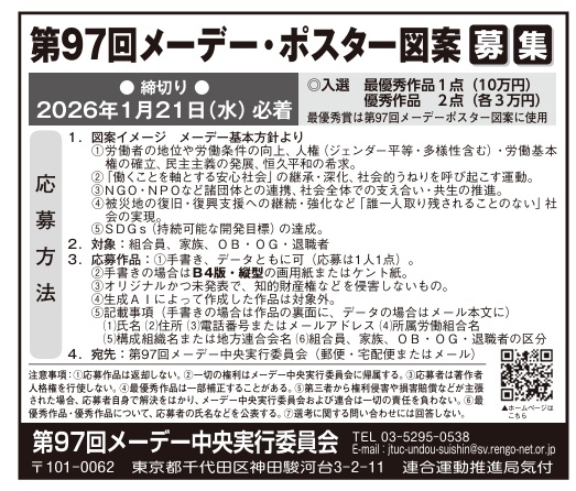 連合本部では、連合組合員とその家族、連合組合員のOB・OG(退職者含む)を対象に、「第97回メーデーポスター図案」を公募しています。
